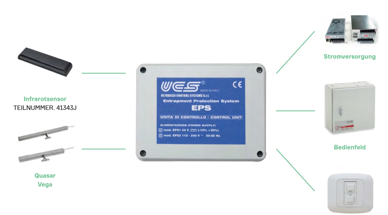 L'EPS può anche emettere un segnale visivo e acustico in caso di intervento del sensore di presenza; è inoltre possibile riprendere l'azione di chiusura non appena la presenza estranea scompare. È possibile collegare più azionamenti e/o sensori all'unità di controllo;
