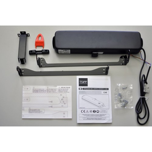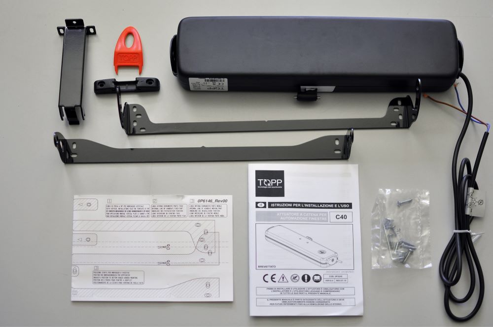 TOPP-Elektroantrieb Modell C40 mit Edelstahl-Doppelgliedkette in einer besonderen Schutzgehäuse aus Epoxydstaub lackiertem Aluminium-Druckguß, komplett mit Halterung und Zubehör, zum Öffnen von Kipp- und Klappfenstern.