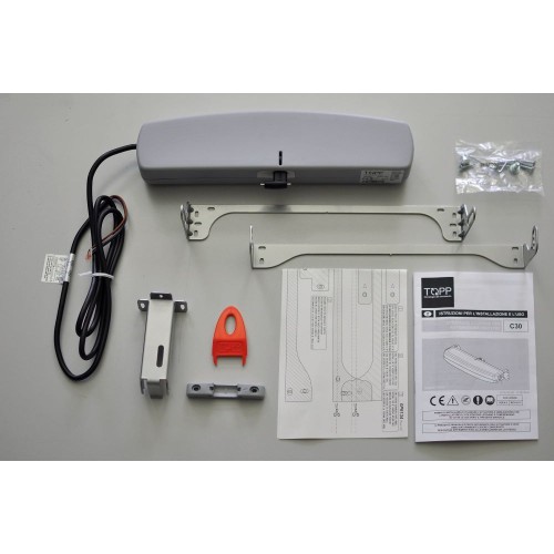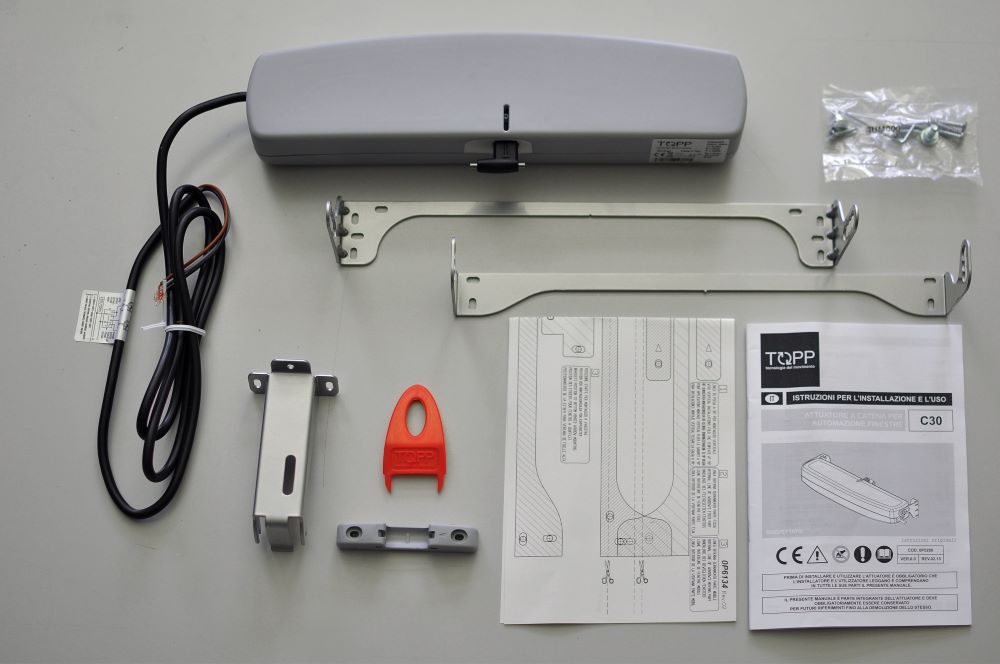 TOPP-Elektroantrieb Modell C30 mit Edelstahl-Doppelgliedkette in einer besonderen Schutzgehäuse aus Epoxydstaub lackiertem Aluminium-Druckguß, komplett mit Halterung und Zubehör, zum Öffnen von Kipp- und Klappfenstern.
